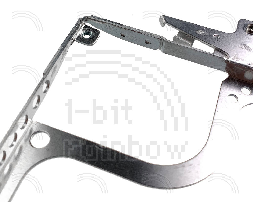 Original Apple display chassis for all models of iBook G3 Clamshell that have an IBM LCD. It includes the sleep magnet and the two black rubber blocks that support the sleep light and LVDS connector. The inverter board, LCD panel, sleep light board, and airport antenna board all mount onto this chassis.