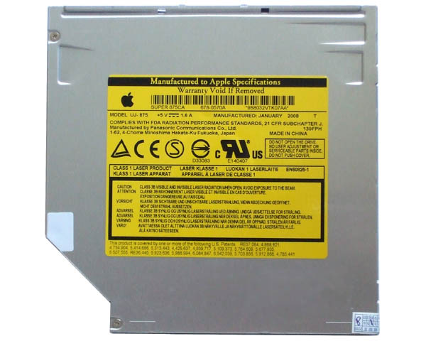 Refurbished, tested, Apple branded Panasonic (Matsushita) UJ-875 slimline, slot loading multi DVD burner with 22mm pickup. This drive has never been used in a computer. It is a service spare which may has been re-tested but may have surface marks due to poor storage. The drive offers full 8X recording speeds on DVD±R Discs plus the ability to record on DVD+R Double Layer and DVD-RAM formats, including DVD±RW and CD-R/RW. This drive is the replacement for UJ-845, UJ-846 & UJ-85J models.