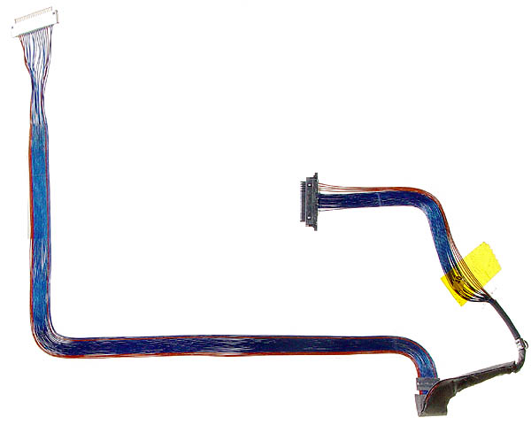LVDS display data cable for 1GHz, 1.2GHz, 1.33GHz & 1.5GHz (BlueTooth 1.1) models of 15" Aluminium PowerBook G4. This cable will not work with the Bluetooth 2 version of the 1.5GHz PowerBook or any of the 1.67GHz models. This cable can be distinguished from the later version as it is longer at the logic board end. The LVDS cable carries the image data from the logic board, through the hingle to the back of the LCD panel. Failure of this cable can result in intermittent or scrambled display image, noise on the display image or a complete loss of the screen image (backlight would typically still be on).