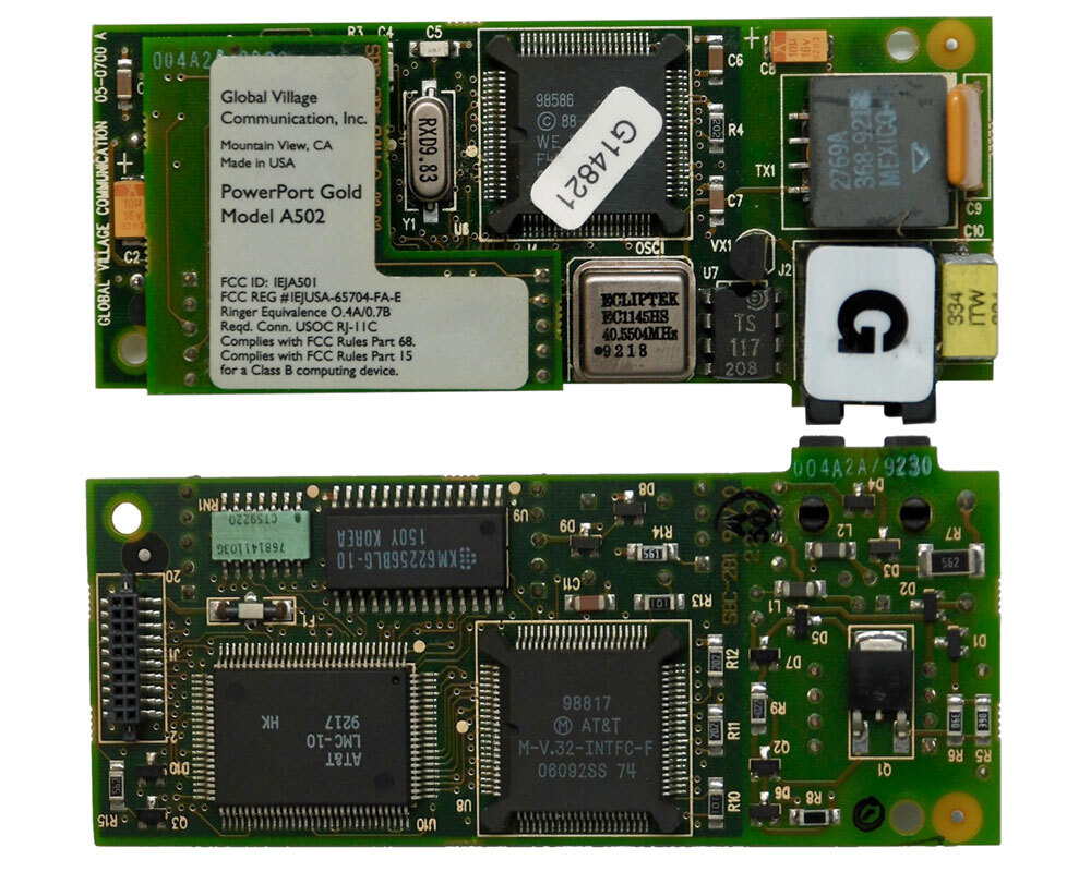 Global Village PowerPort Gold, 14,400bps internal Fax/Data Modem board which was originally supplied as an option for the PowerBook 140, 145, 145B, 160, 165, 165c, 170, 180 and 185c. This board presents as an rj11 on the rear of the PowerBook so you can connect directly to the phone line without need for a DAA.