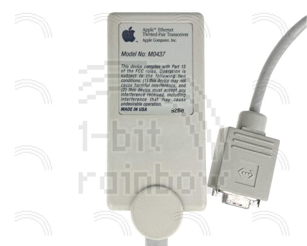Fully tested and working, original Apple AAUI to UTP (Unshielded Twisted Pair or 10baseT) transceiver for use with any Macintosh with an AAUI ethernet port. Does not require any driver software other than the ethernet software in Mac OS. Back in the day when ethernet came in three flavours; thick, thin and twisted pair, the transceiver was a way of building ethernet support into a Macintosh but allowing the type of ethernet to be decided by the transceiver you bought.