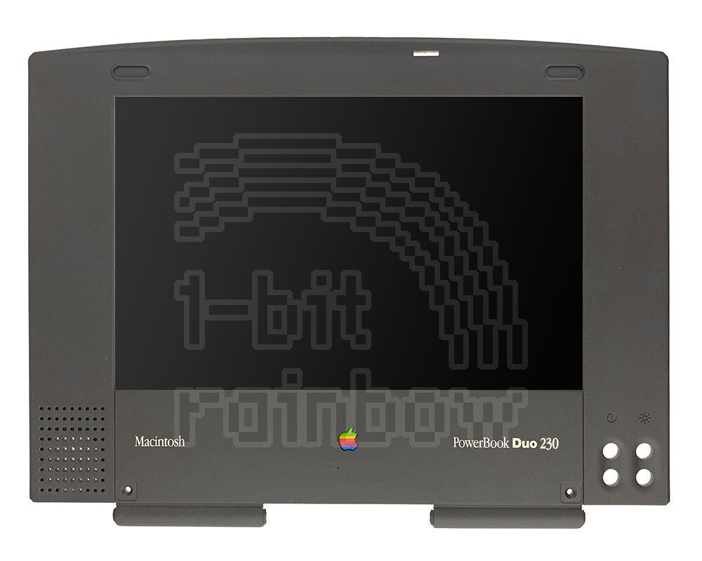 Original Apple, fully tested Sharp FSTN (passive matrix) 9-inch greyscale LCD panel and display bezel for the PowerBook Duo 230 providing 16 shades of grey at 640x400 pixels.