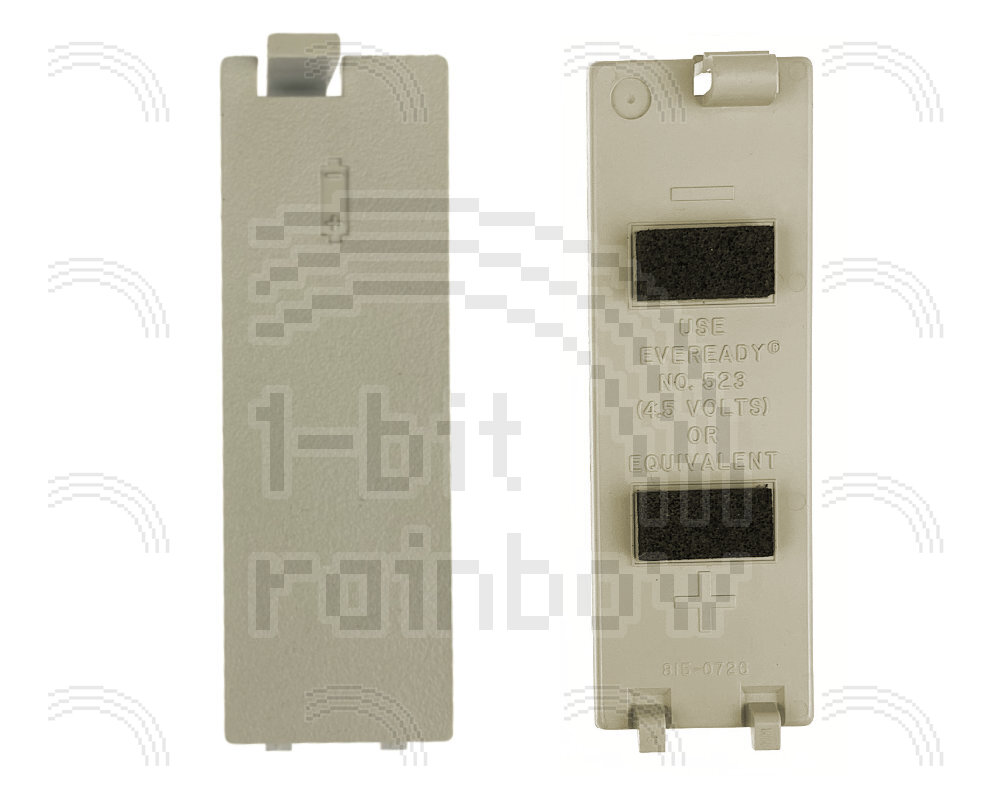 Original Apple battery door/cover for the original Macintosh 128K, 512K and beige version of the Macintosh Plus. There are various interchangeable versions of the battery door including two different battery icons on the front, some with 2 pieces of foam inside and one without. This variant has the smaller battery icon and has the foam pads on the back. Some bear the same part number as the v1 and v2 doors, and some have a later part number.
