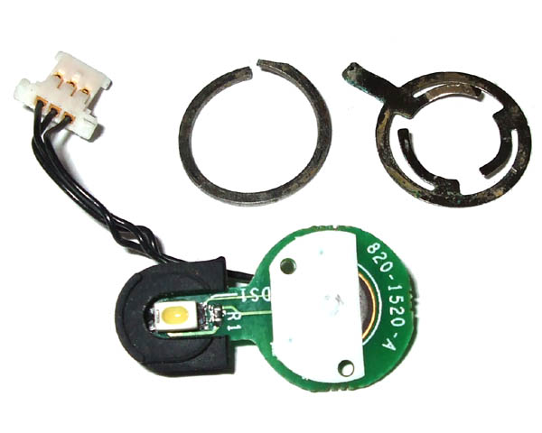 This is the power button board and sleep light from the single 1.8 PowerMac G5 including retaining ring and spring. This board has an attached cable which connected to the IO board.